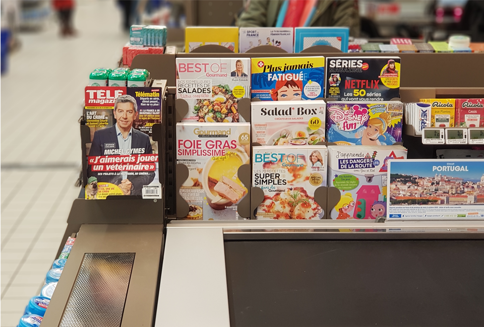 Plus de 5000 hyper et supermarchés de toutes les enseignes exposent notre offre en devant de caisse.